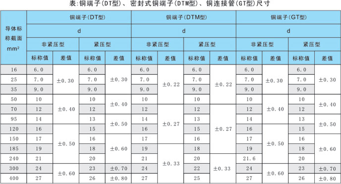 按照GB14315-93《電力電纜導(dǎo)體用壓接型銅、鋁接線端子與連接管》標(biāo)準(zhǔn),銅端子--(DT型)、密封式銅端子(DTM型)、銅連接管(GT型)的內(nèi)徑尺寸如下: